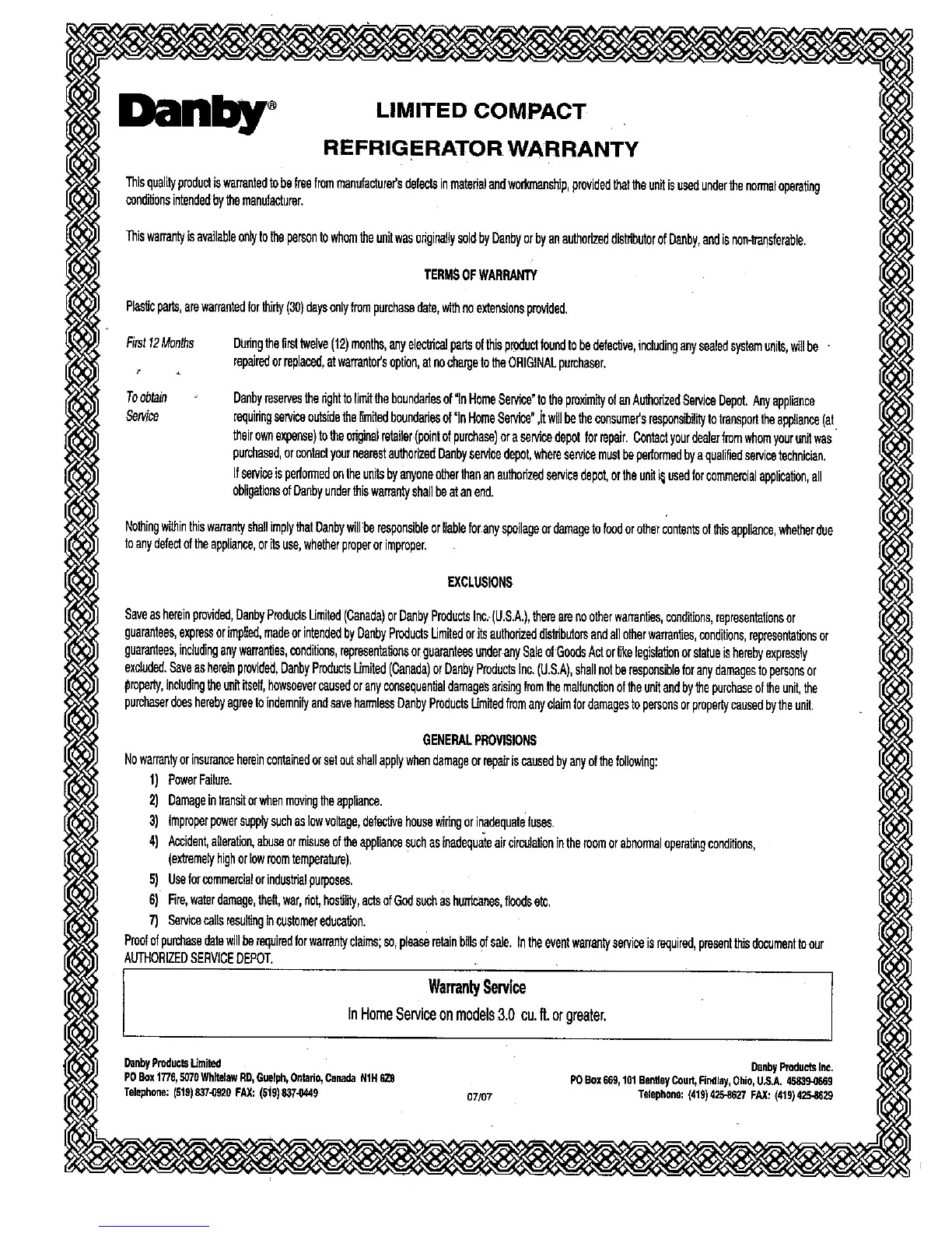 Danby DCR34W - LIMITED COMPACT REFRIGERATOR WARRANTY; TERMS OF WARRANTY; EXCLUSIONS; GENERAL PROVISIONS