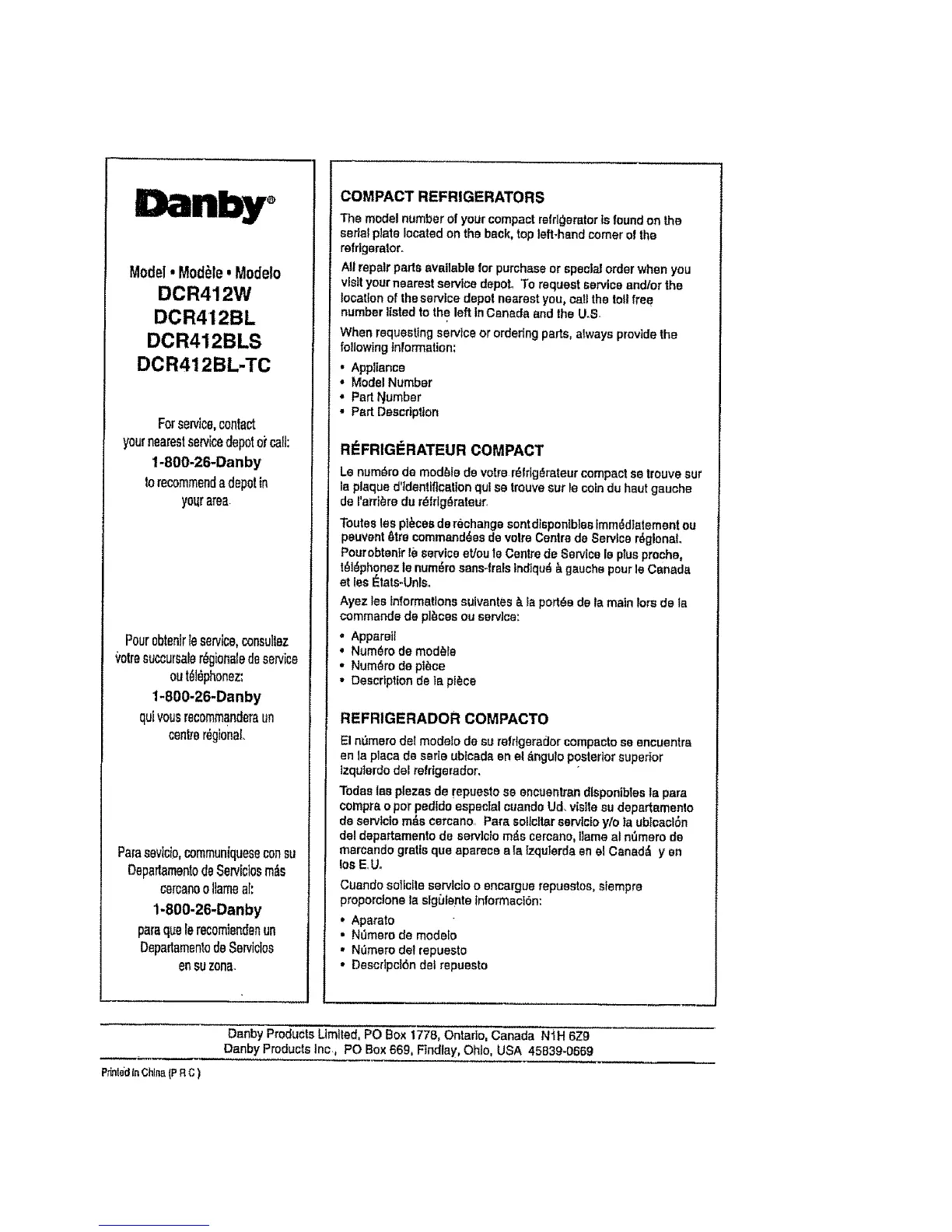 Danby Products Limited, PC Box 1778, Ontado, Canada NiH 6Z9