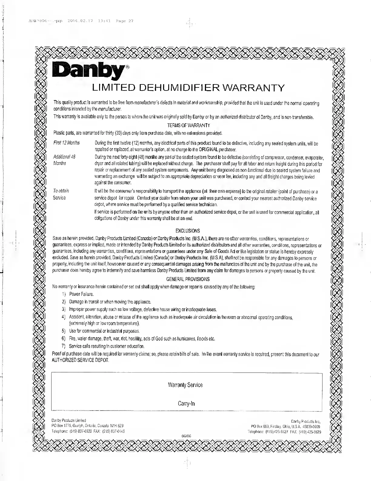 Danby DDR4007EE - Warranty