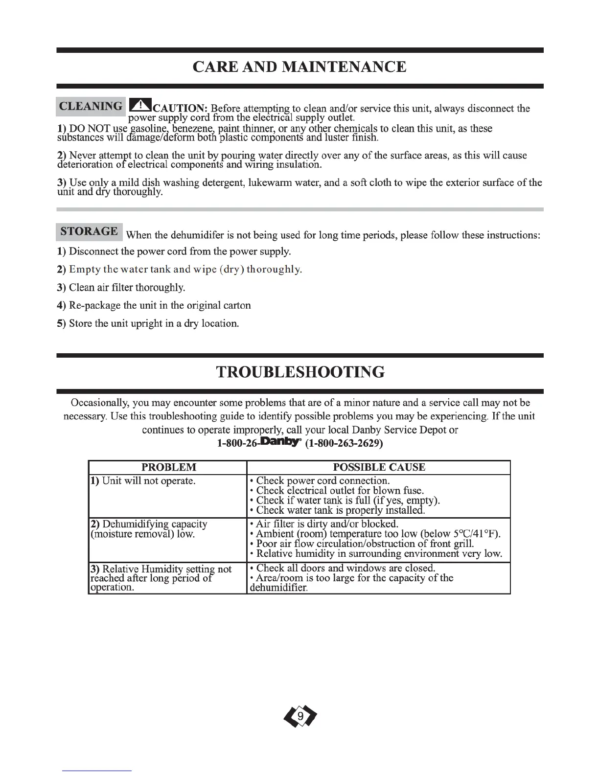 Danby DDR60A3GP - Care and Maintenance; Troubleshooting