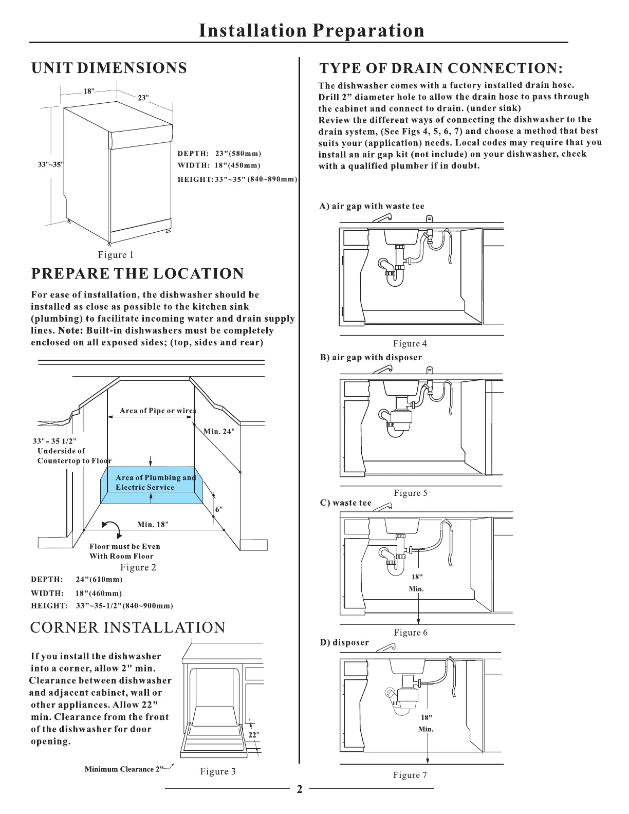 Danby DDW1899BLS - Unit Dimensions; Prepare the Location; Corner Installation; Type of Drain Connection