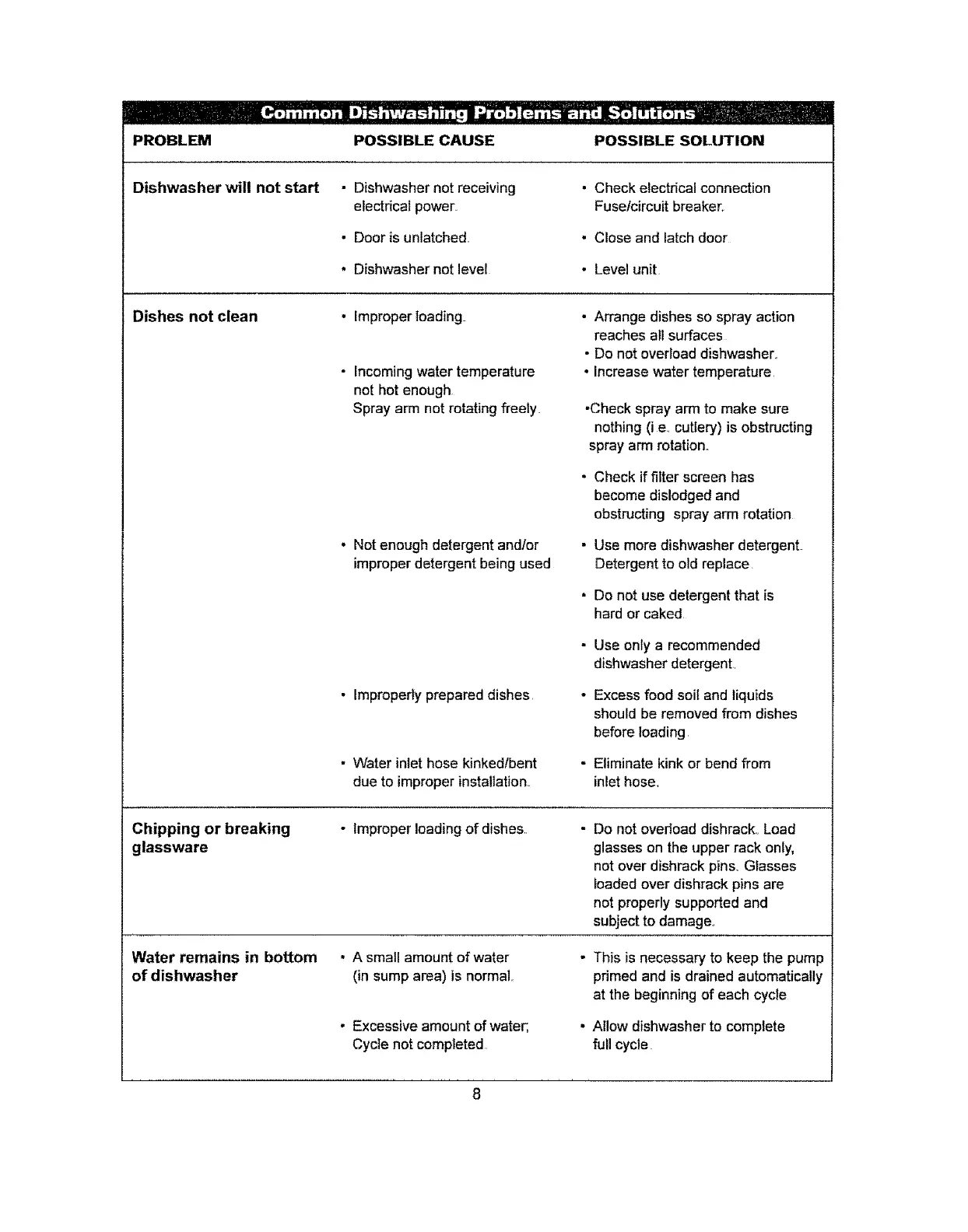 Dishwasher will not start • Dishwasher not receiving • Check electrical connection