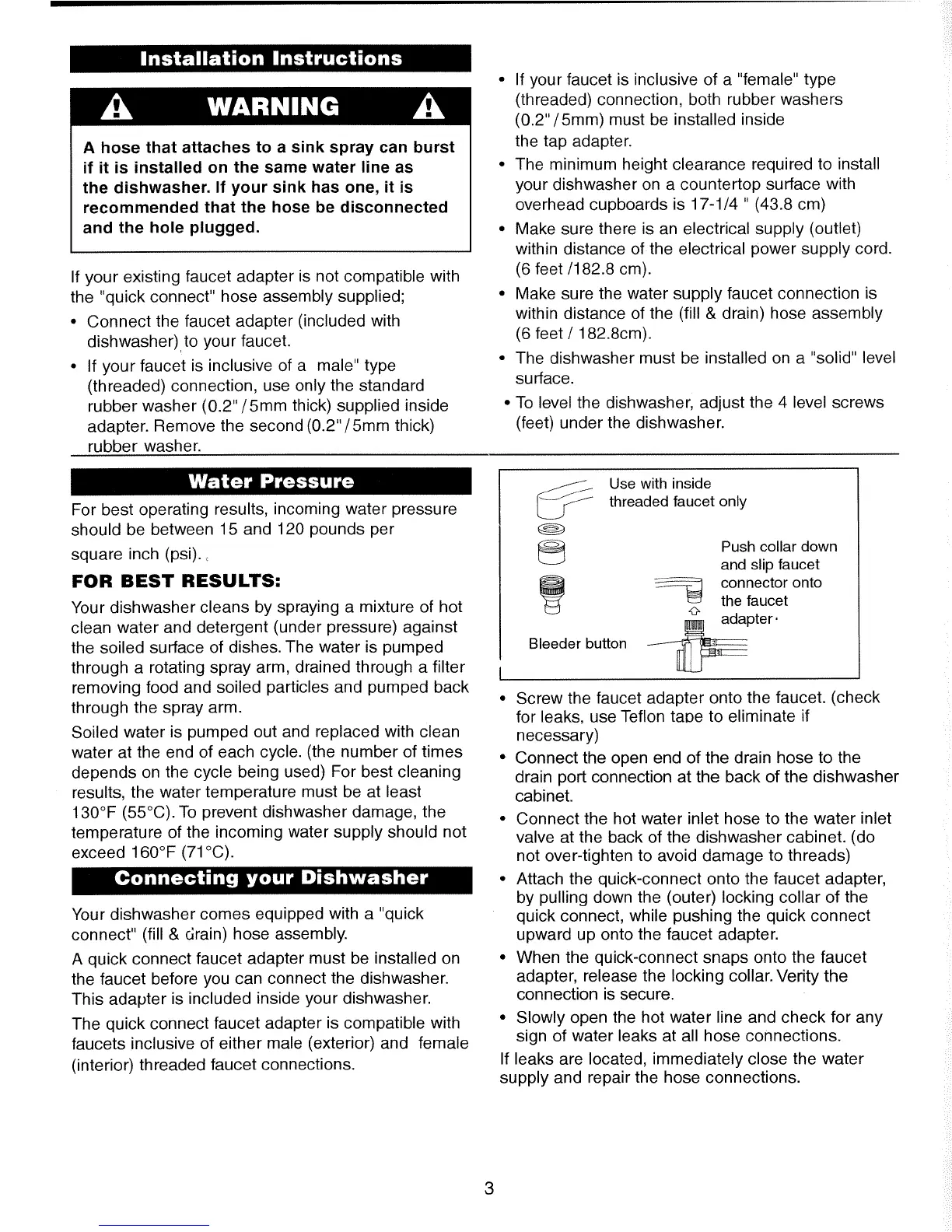 Danby DDW496W - Installation Instructions; Water Pressure Requirements; Connecting the Dishwasher