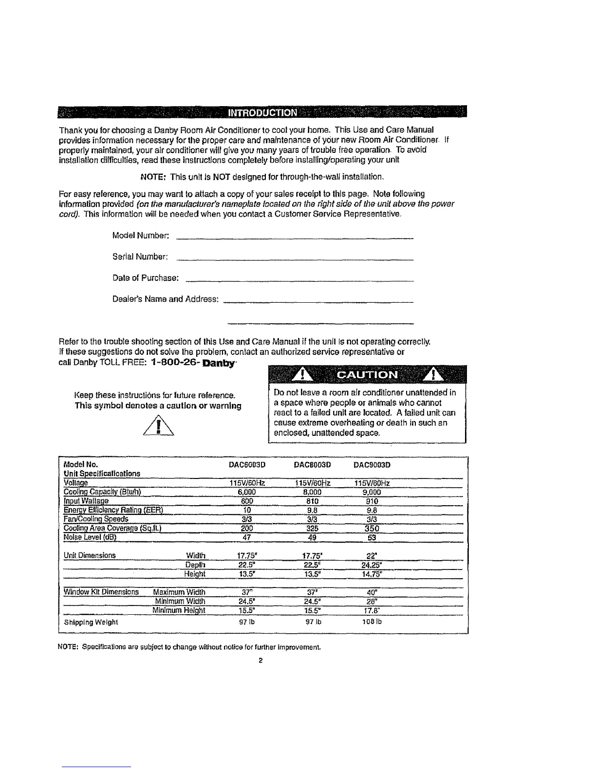 Thank you for choosing a Danby Room Air Conditioner to coot your home. This Use and Care Manual