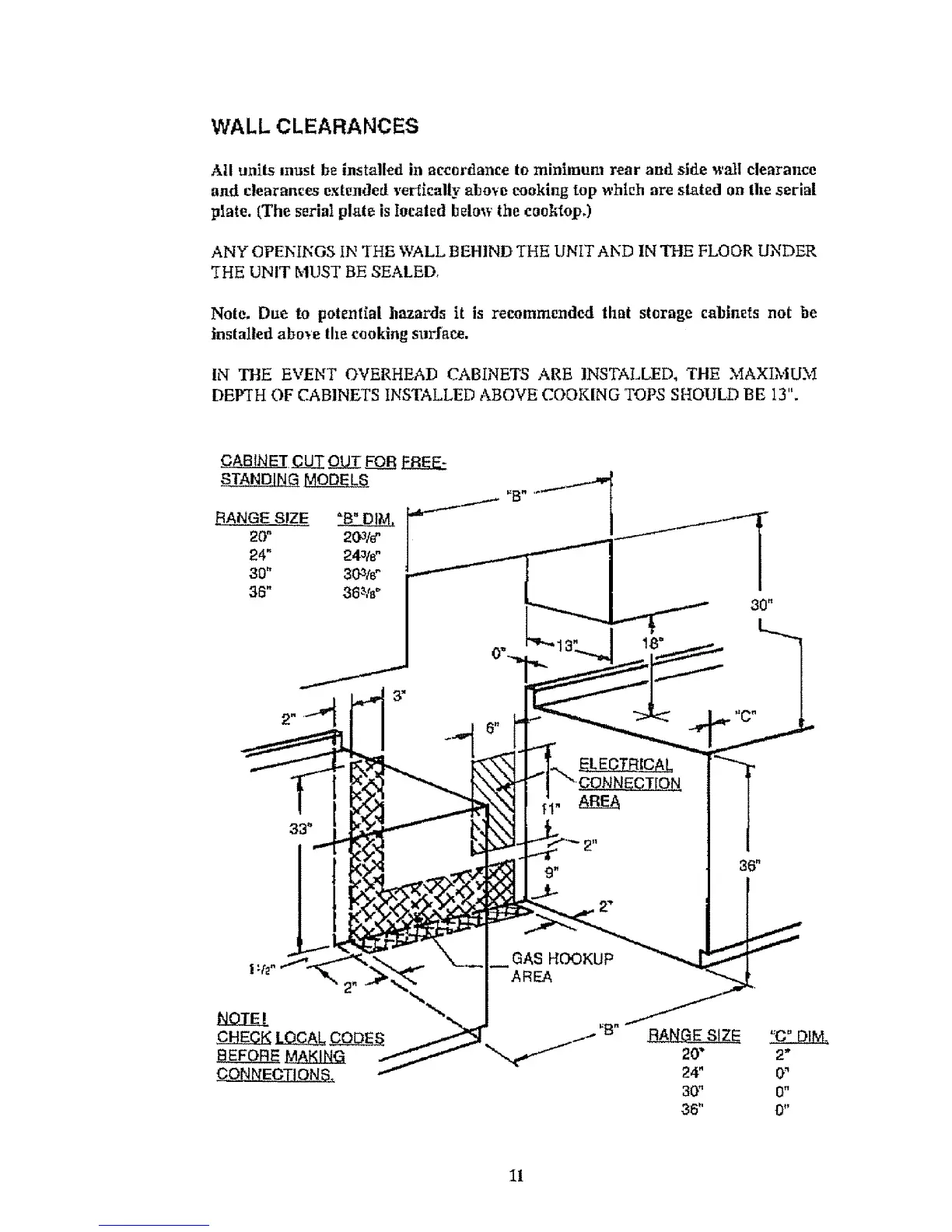 and clearances extended vertically above cooking top which are stated on tile serial