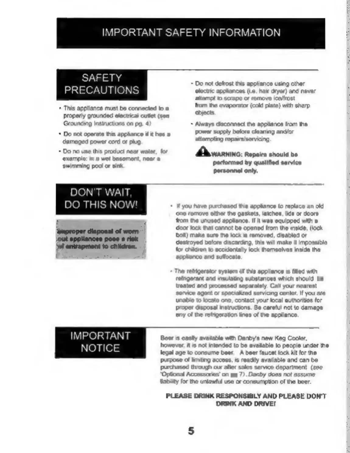 Danby DKC645BLS - Important Safety Information; Grounding Instructions; Safety Precautions