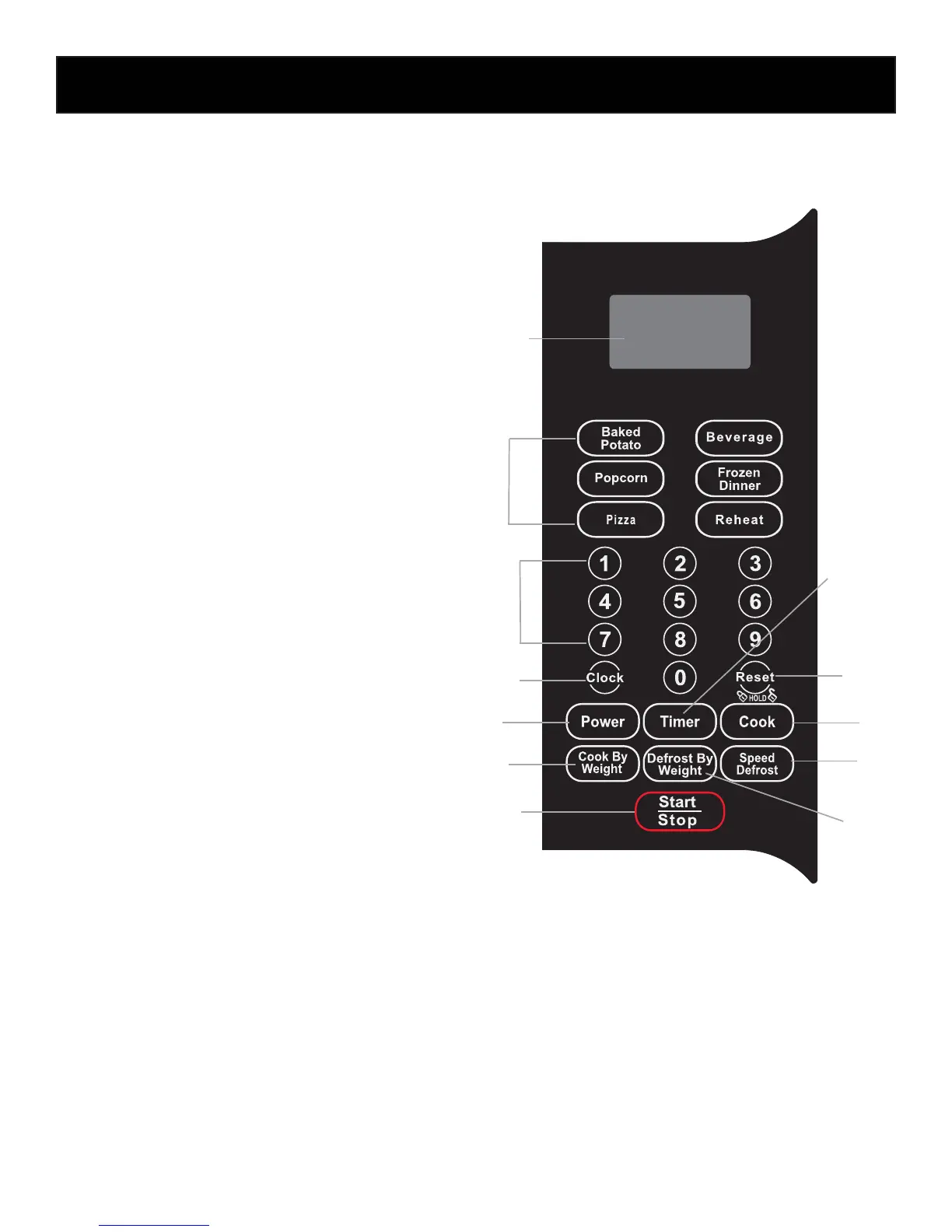 1) DISPLAY: Shows cooking time, power, indicators, and