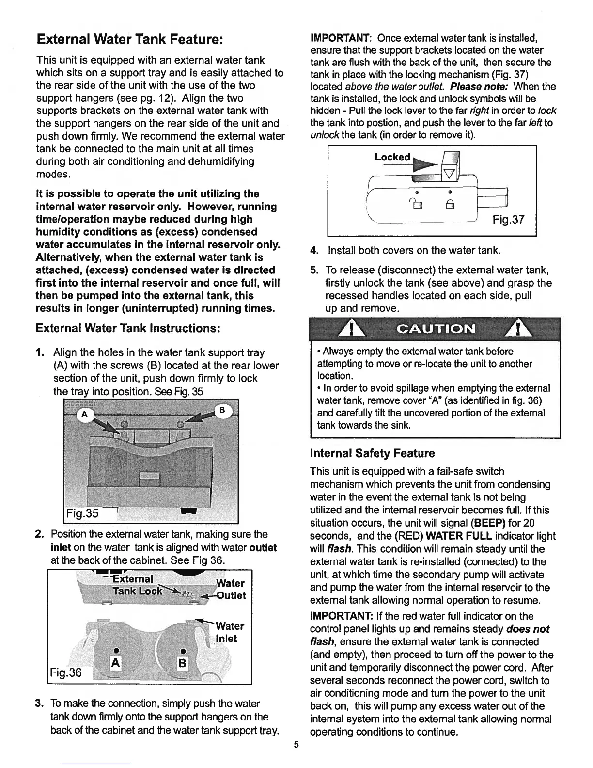 Danby DPAC10071 - External Water Tank Feature; External Water Tank Instructions; Internal Safety Feature