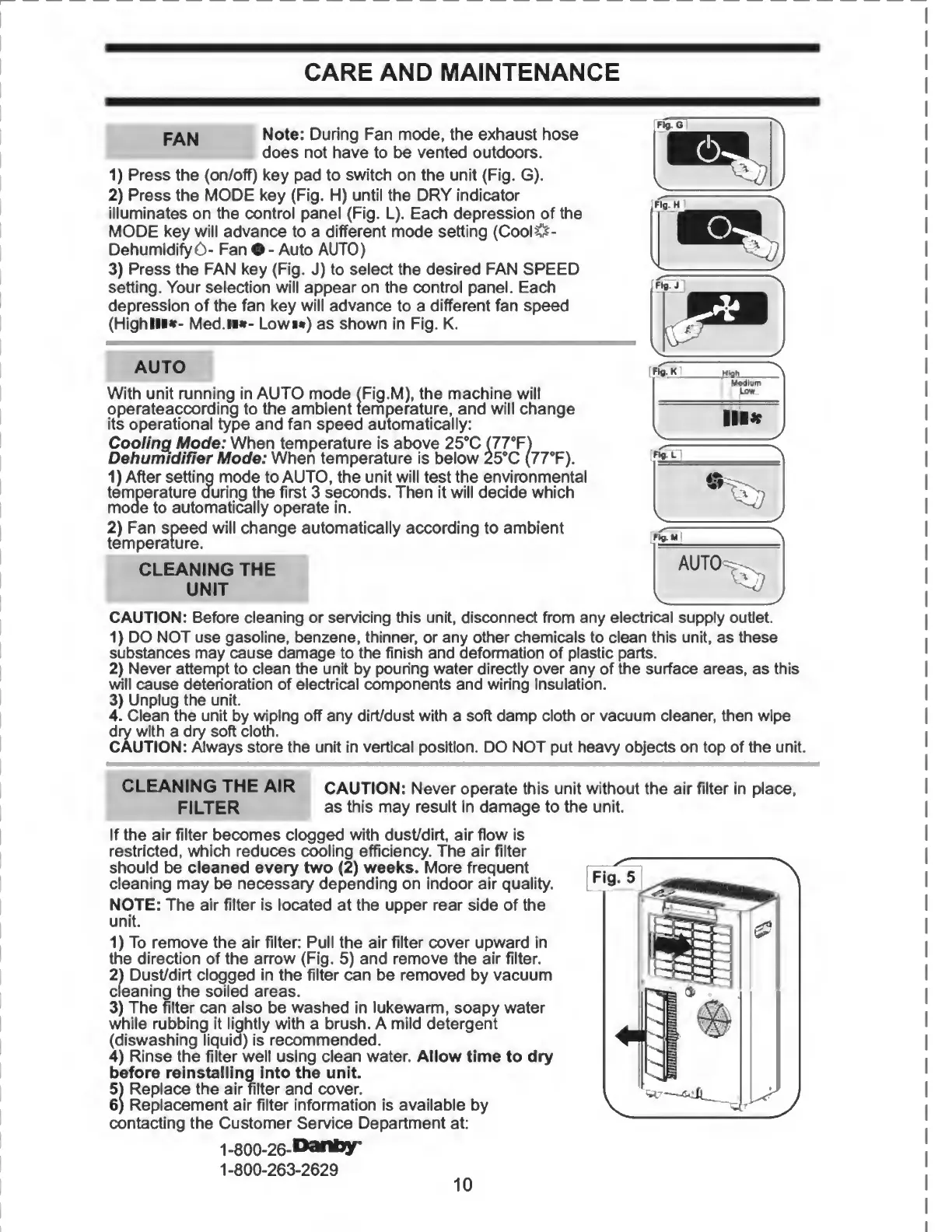 Danby DPAC8KDB - Care and Maintenance Procedures; Fan and Auto Mode Operation; Cleaning the Unit and Air Filter