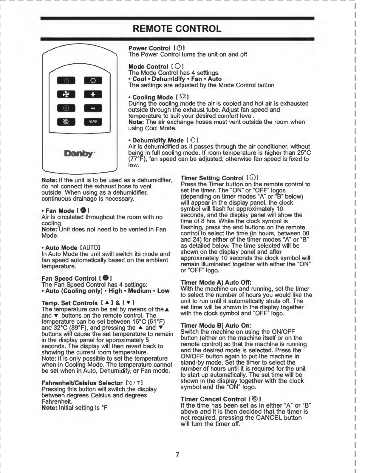 Danby DPAC8KDB - Remote Control Operation; Power and Mode Controls; Temperature and Timer Settings