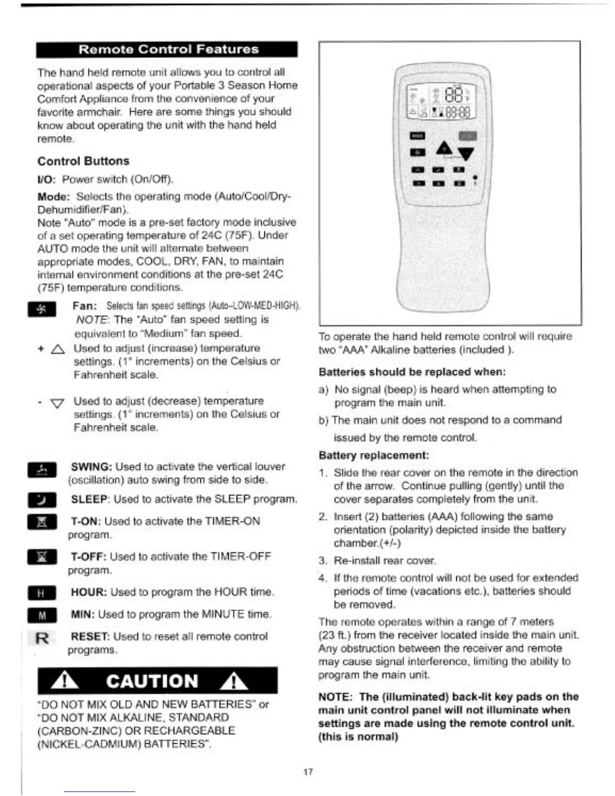 Danby DPAC9008 - Remote Control Features; Remote Control Buttons