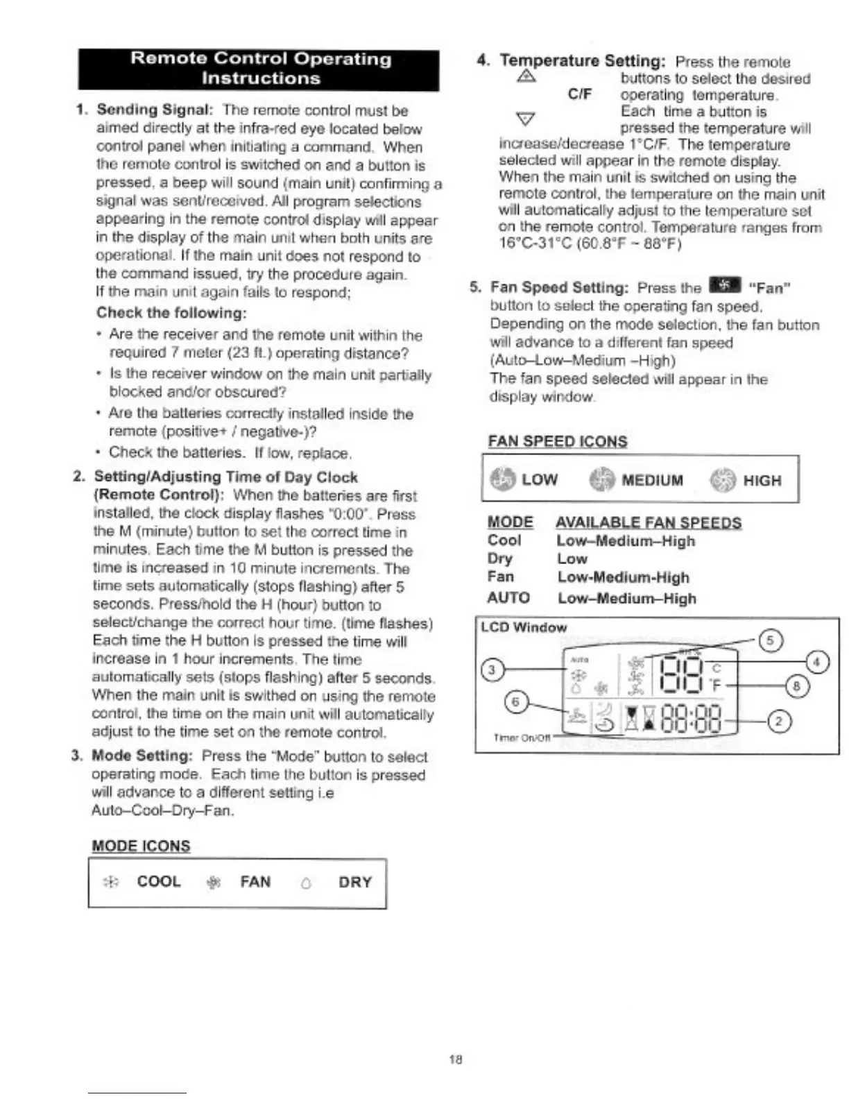 Danby DPAC9008 - Remote Control Operation Guide; Sending Signal to Unit; Setting Remote Clock; Selecting Remote Modes