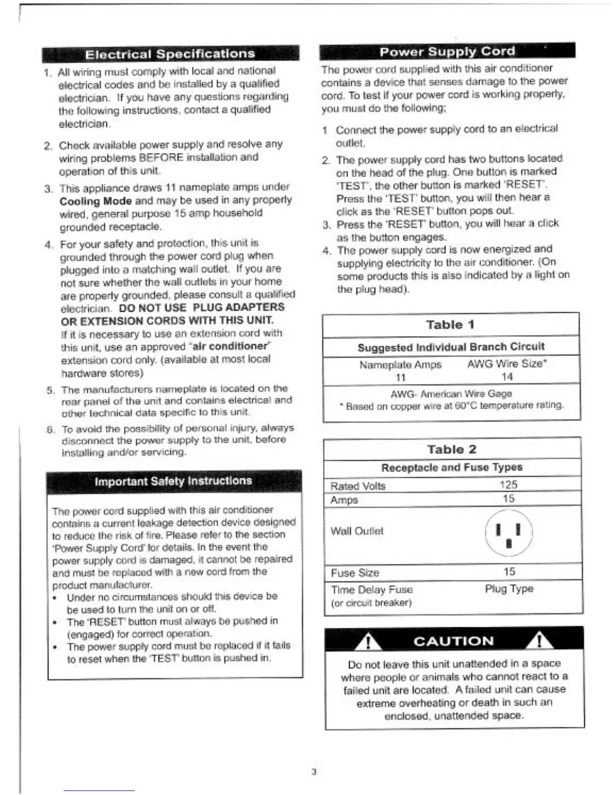 Danby DPAC9008 - Electrical Specifications; Important Safety Instructions; Power Supply Cord