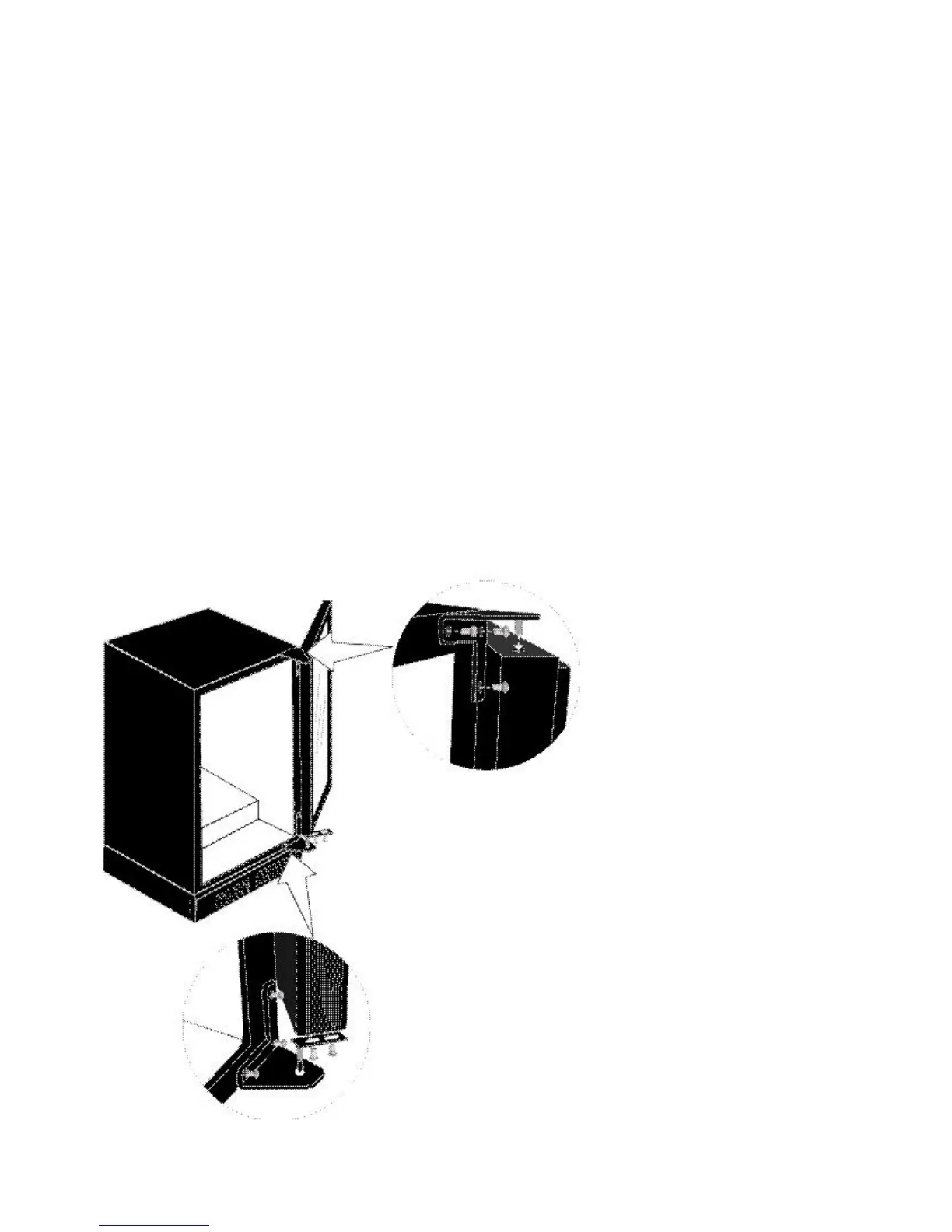 9. Insérez le support inférieur de la porte dans la charnière inférieure. Ne serrez pas les vis avant que la porte ne soit installée.