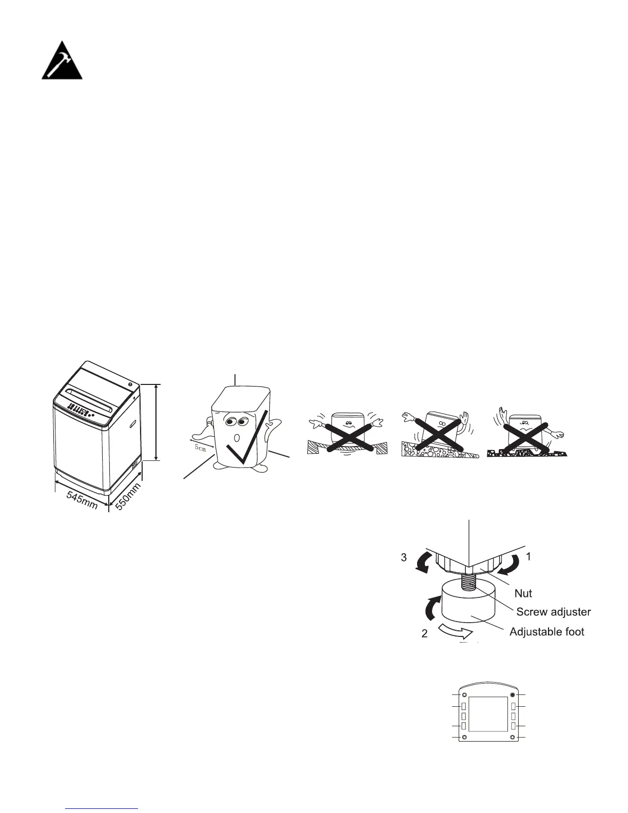 If the fl oor is uneven adjust the adjustable foot (do not insert pieces of wood,