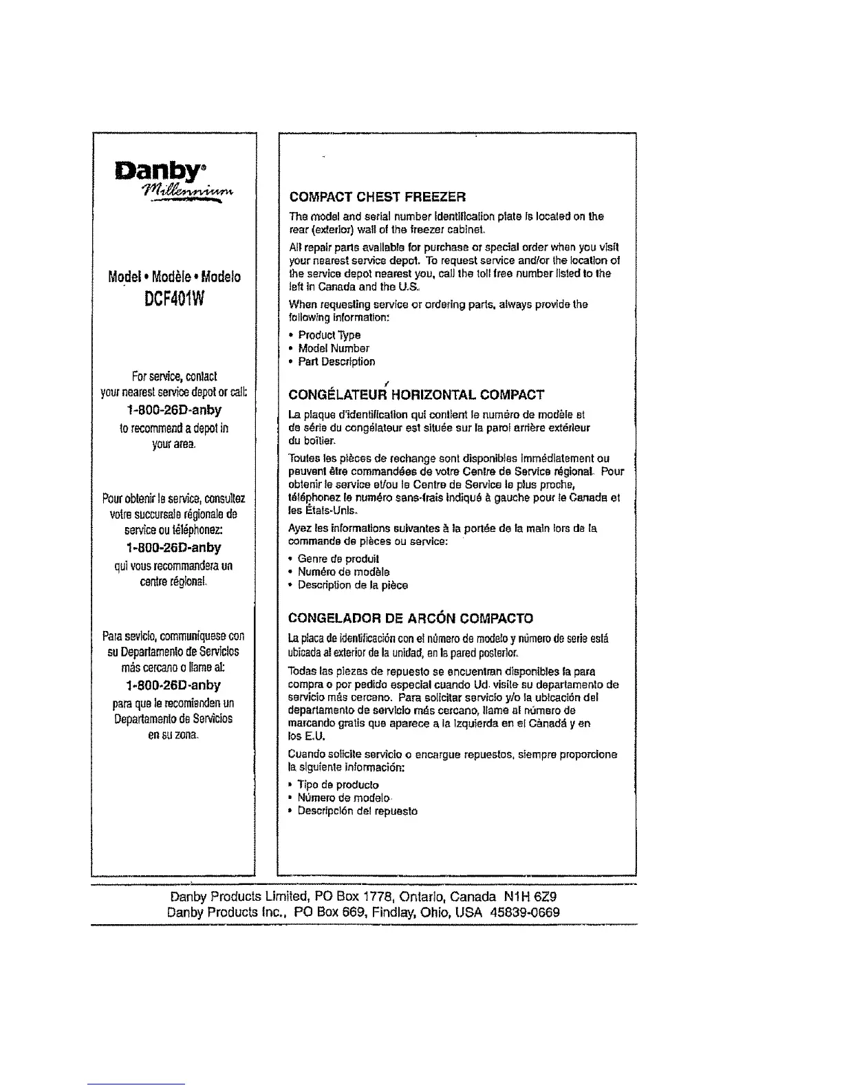 Danby ProductsLimited, PO Box 1778, Ontario, Canada N1H 6Z9