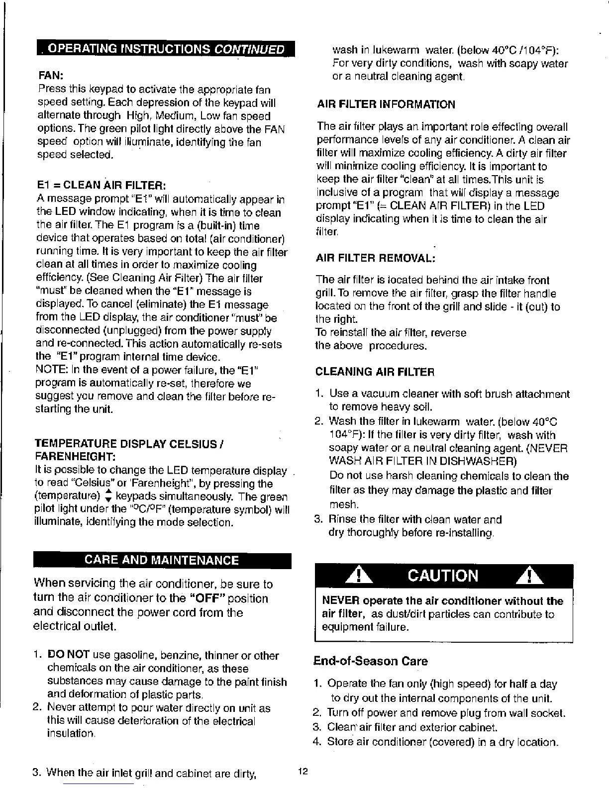 Danby Simplicity SAC10504D - Care and Maintenance; Air Filter Information and Cleaning; End-of-Season Care