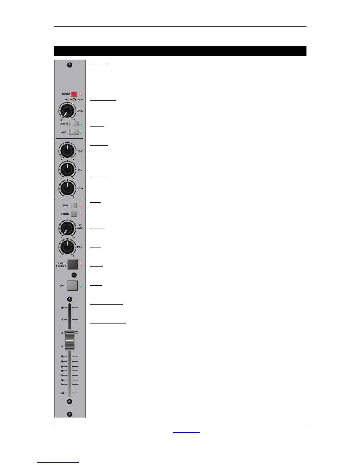 Every channel has a mono switch with LED to send a mono input signal to both outputs of