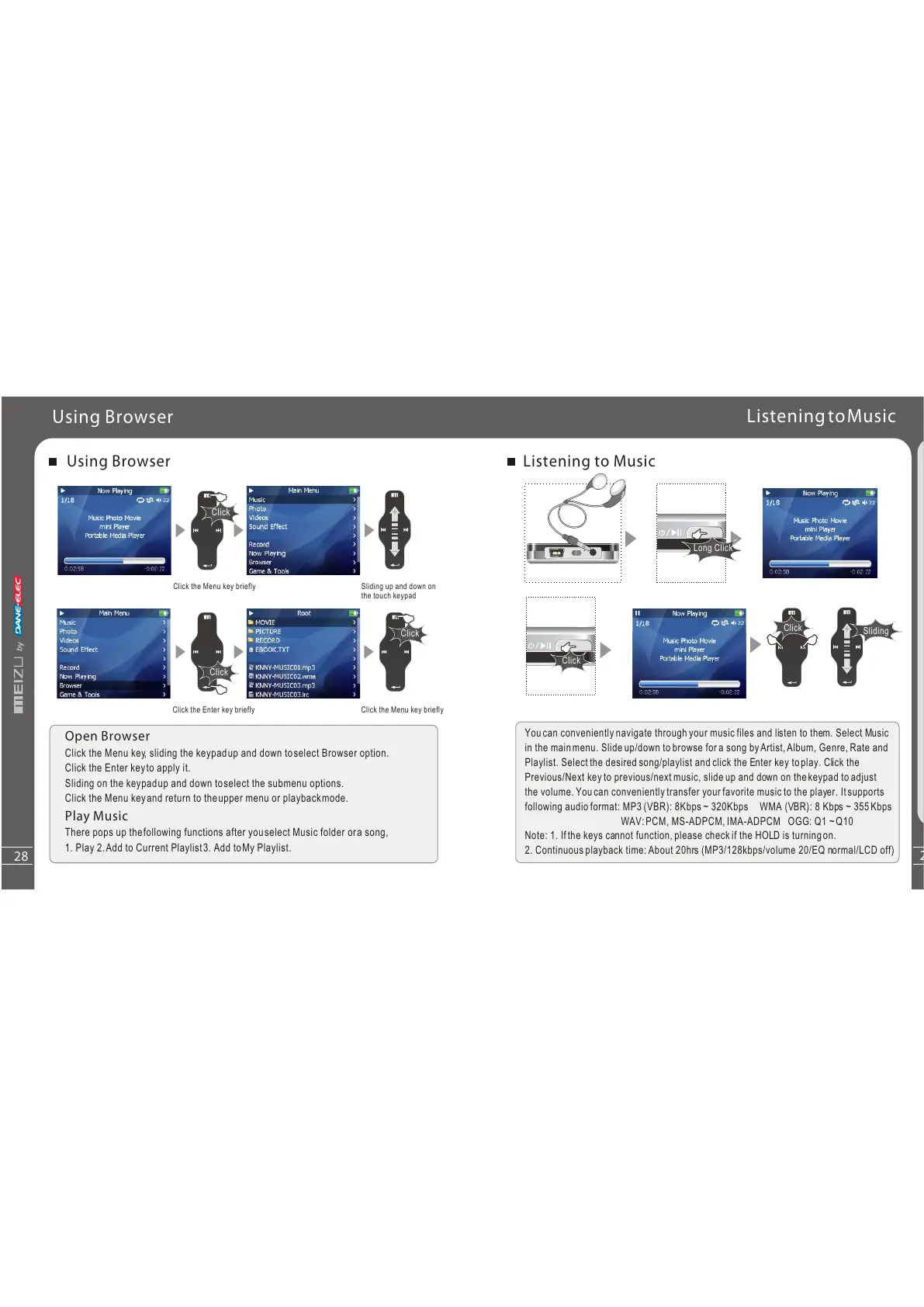 2. Continuous playback time: About 20hrs (MP3/128kbps/volume 20/EQ normal/LCD off)