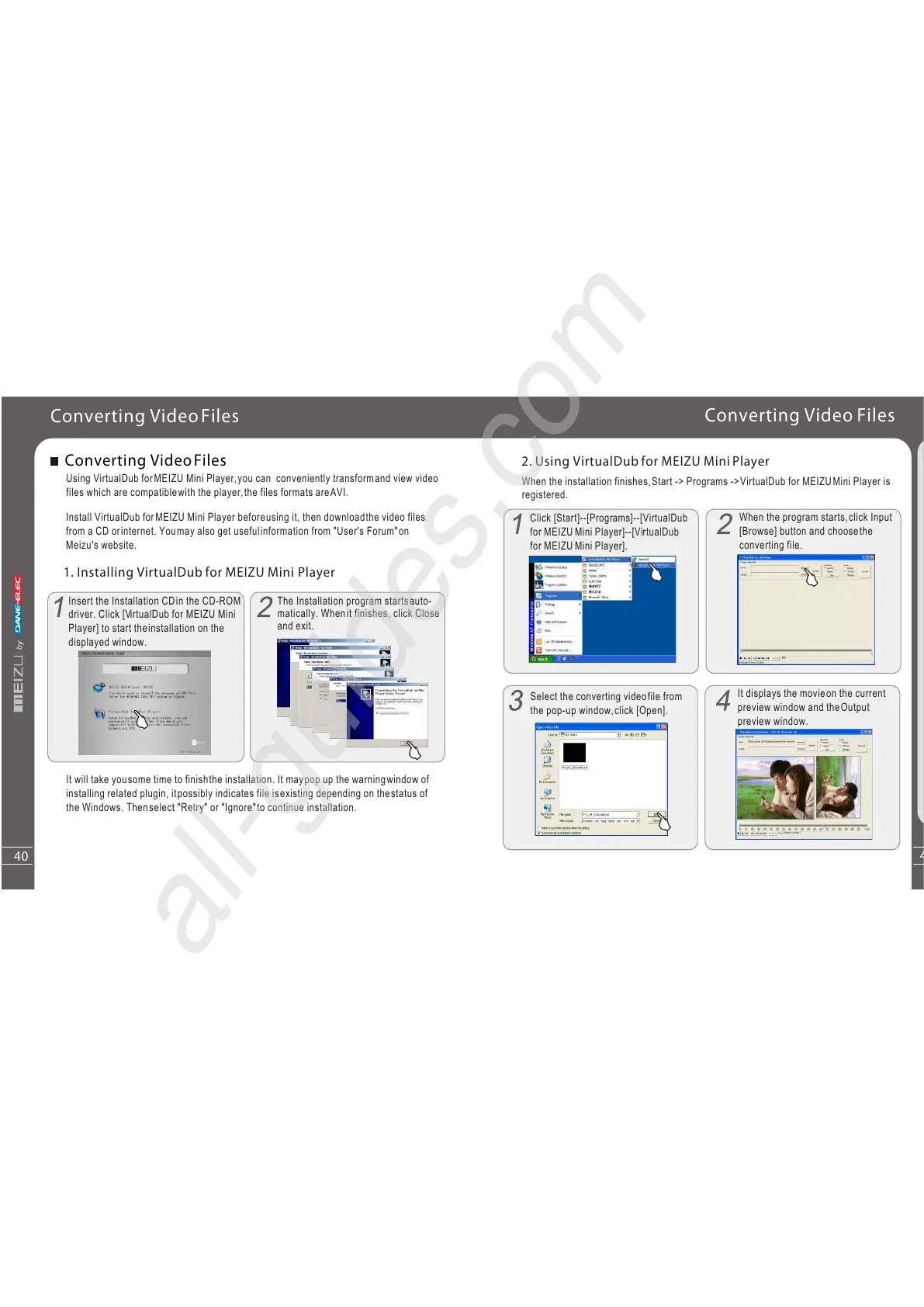 Install VirtualDub forMEIZU Mini Player beforeusing it, then downloadthe video files