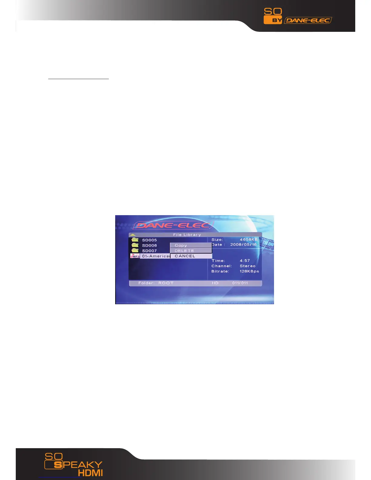 Deleting Files : Select the unwanted files and press the RIGHT direction key, then press ENTER