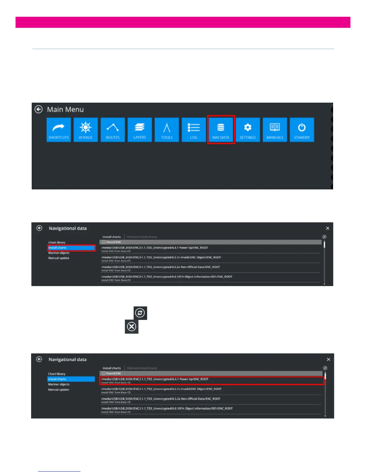2. Select ‘Install Charts’ and then ‘Find and Install Charts’. A list of all ENC Exchange Sets found on removable data storage