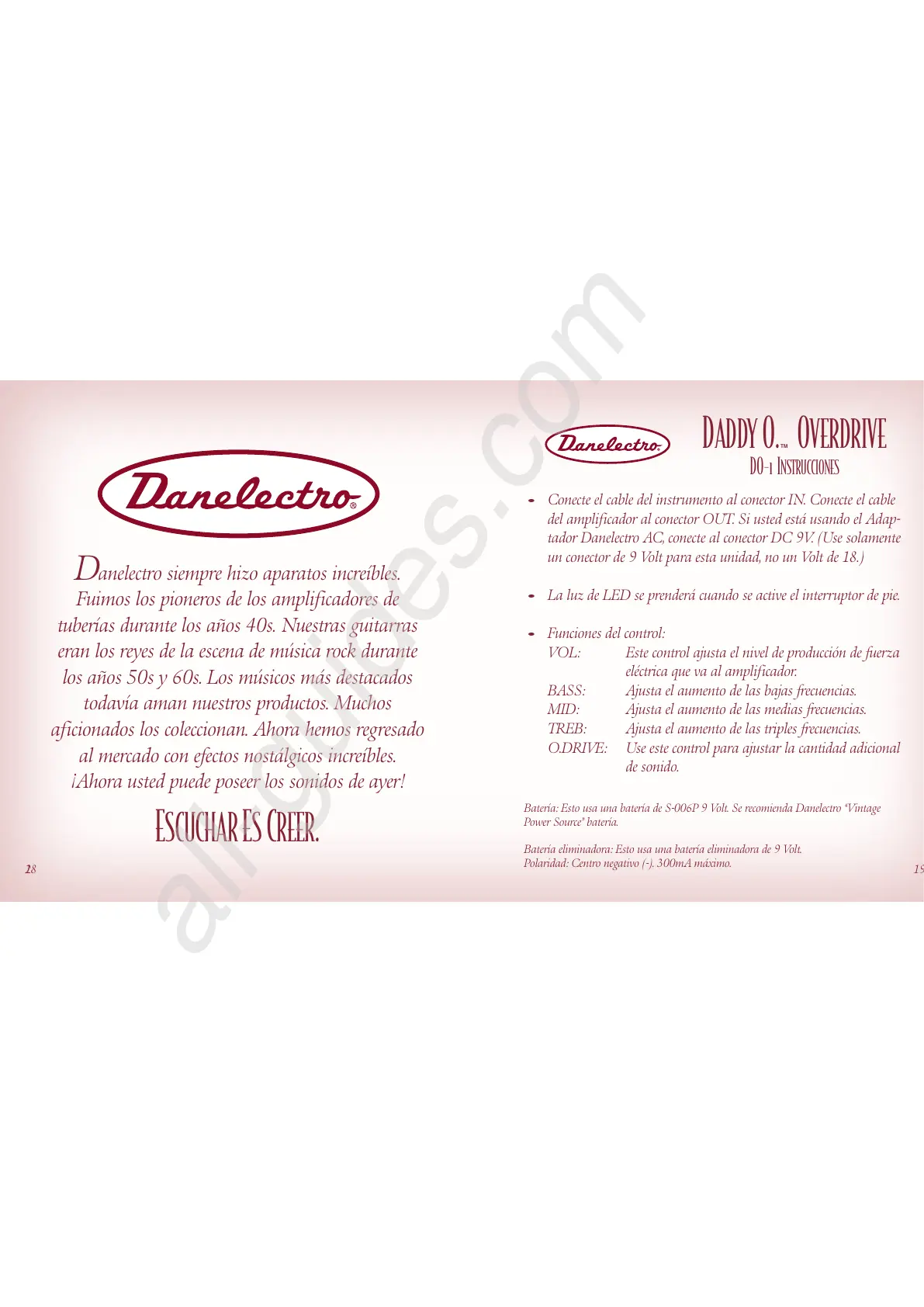 Batería: Esto usa una batería de S-006P 9 Volt. Se recomienda Danelectro “Vintage
