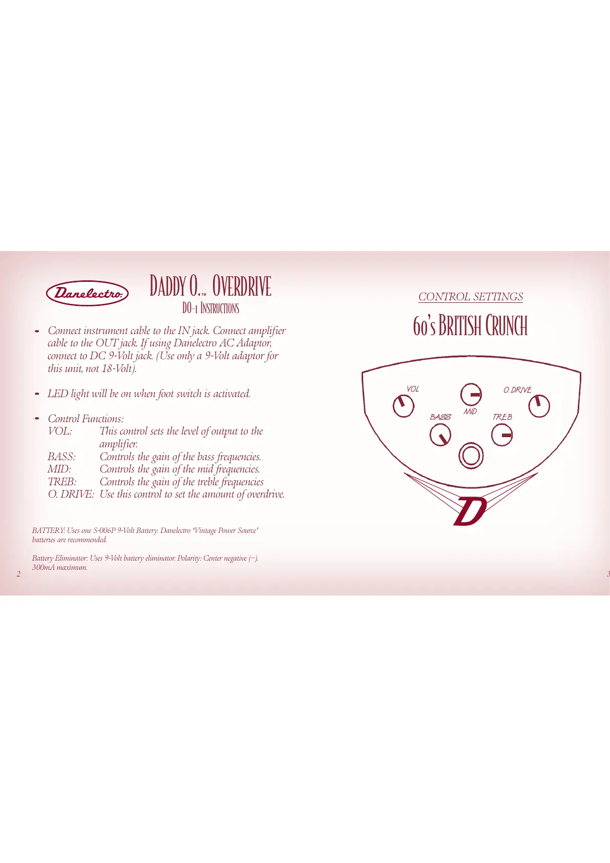 BATTERY: Uses one S-006P 9-Volt Battery. Danelectro “Vintage Power Source”