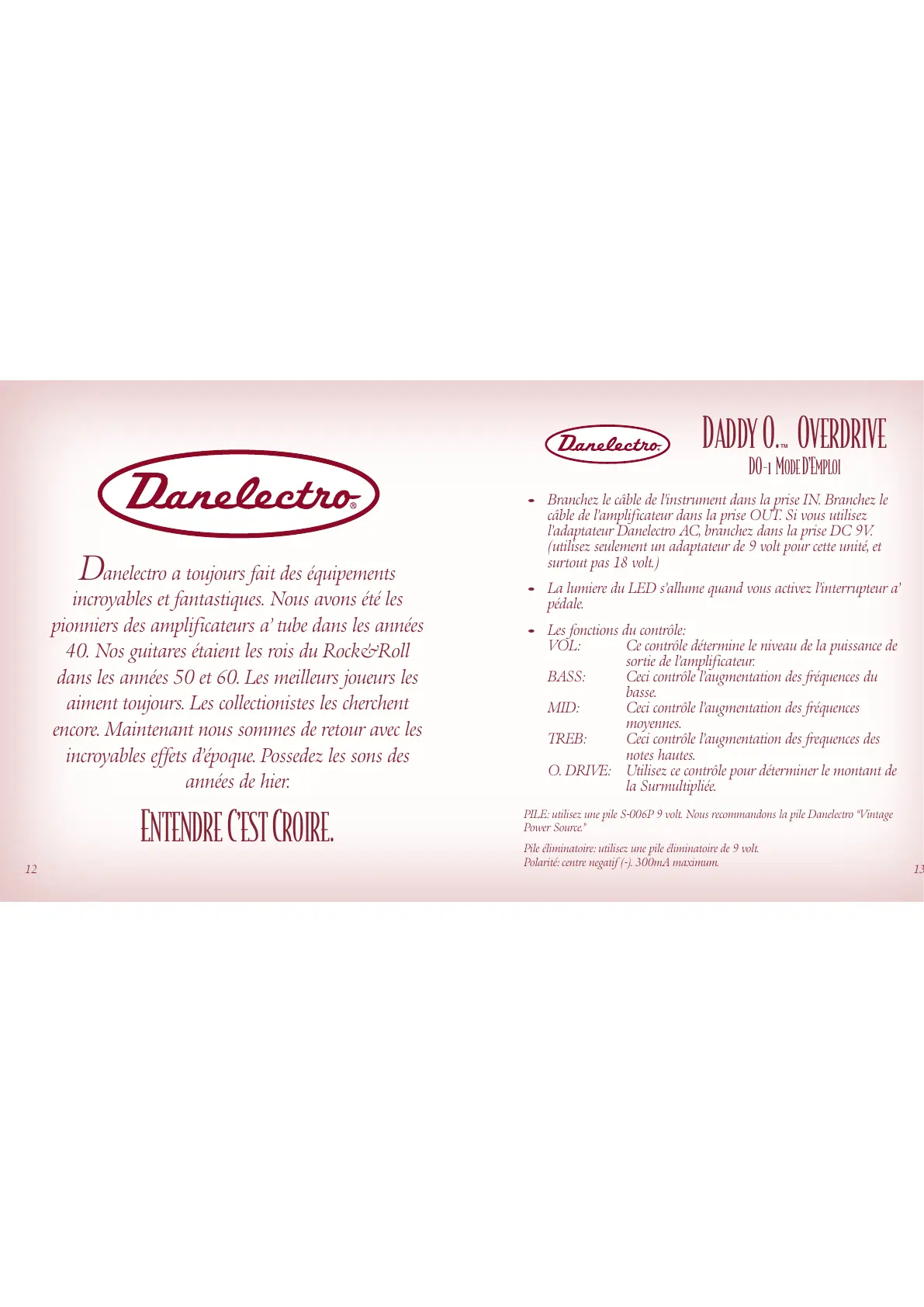 PILE: utilisez une pile S-006P 9 volt. Nous recommandons la pile Danelectro “Vintage