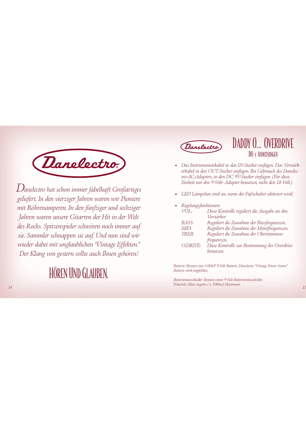 Batterie: Benutzt eine S-006P 9-Volt Batterie. Danelectro “Vintage Power Source”