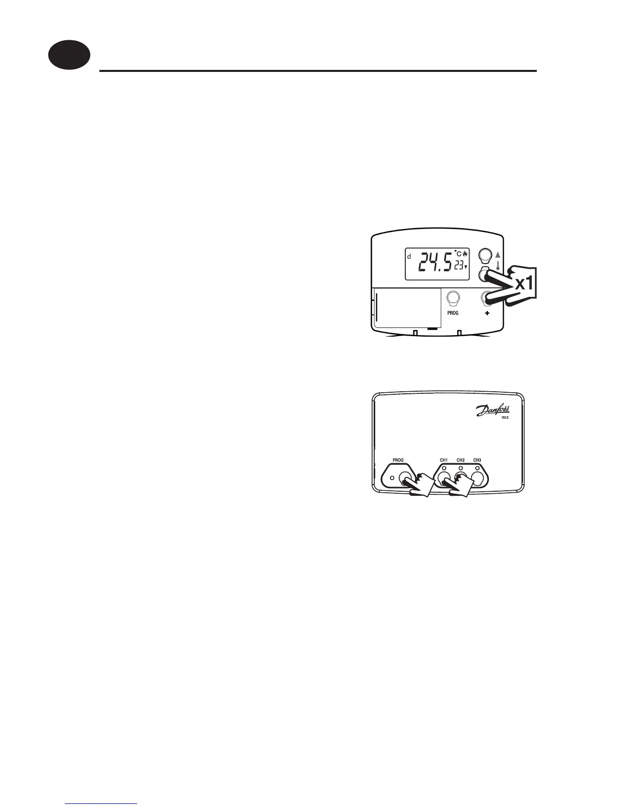 Termostat 2 - vent fem minutter, udfør trin 1-2, og tryk herefter på