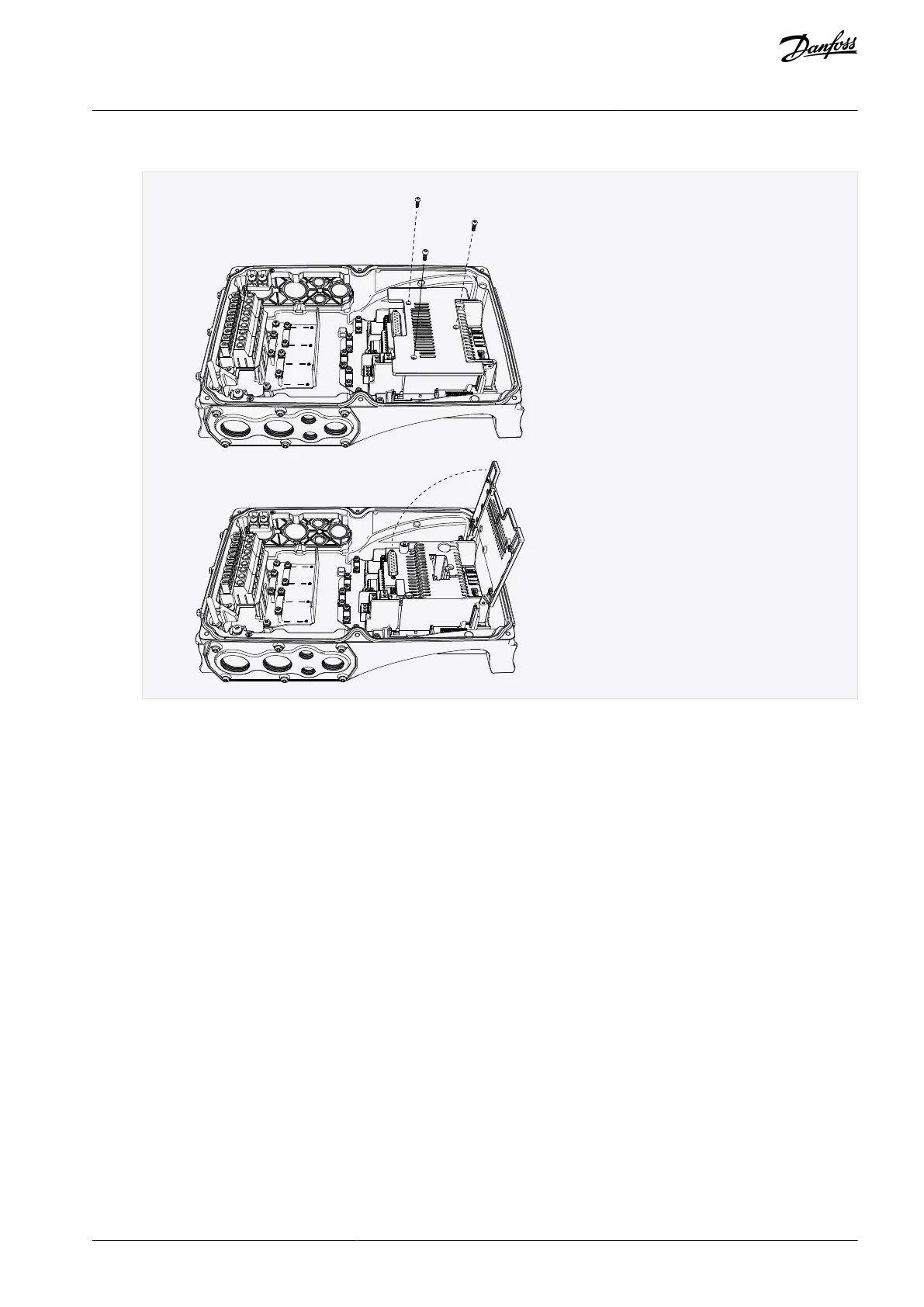 To get access to the option board slots, remove the screws and open the cover of the control unit.