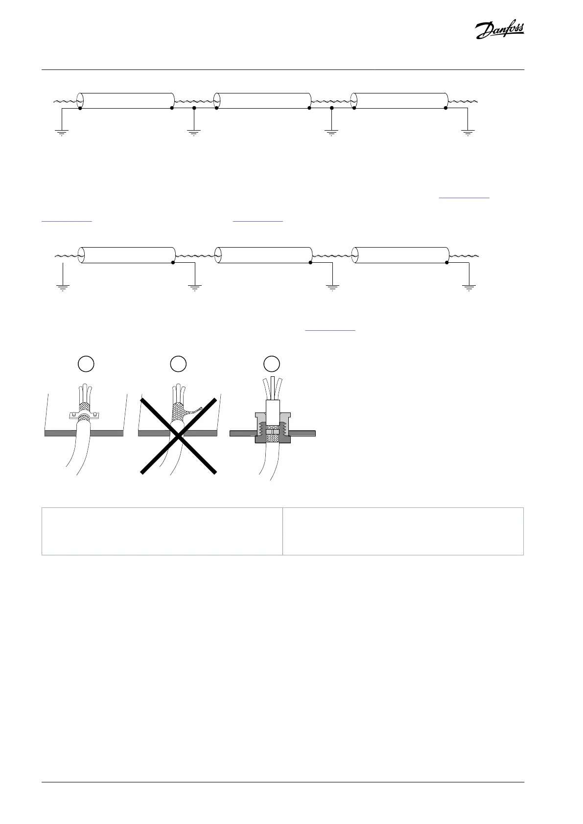 We recommend grounding the cable shield as in examples A and C (see Illustration 11). Do not ground the cable shield as in exam-