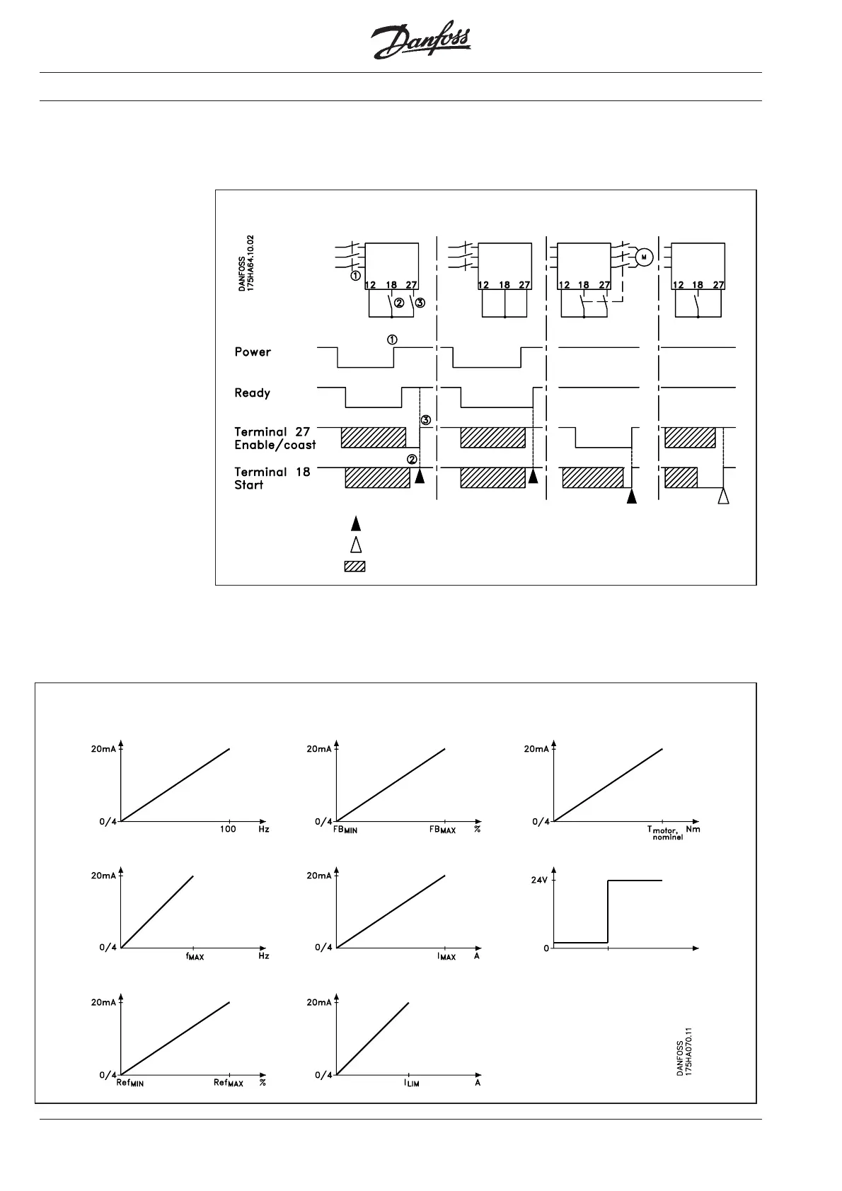 The analogue output signals on terminals 42/45 set in parameters 407/408.