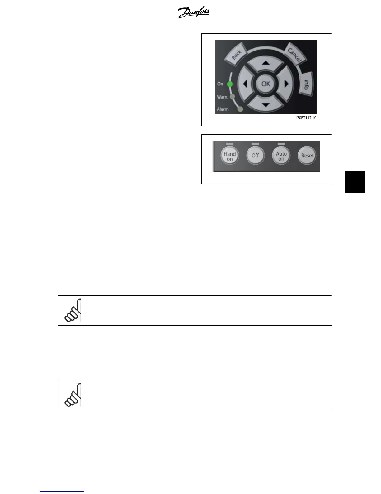 enables control of the frequency converter via the GLCP. [Hand on] also starts the motor, and it is now possible to give the motor speed reference by