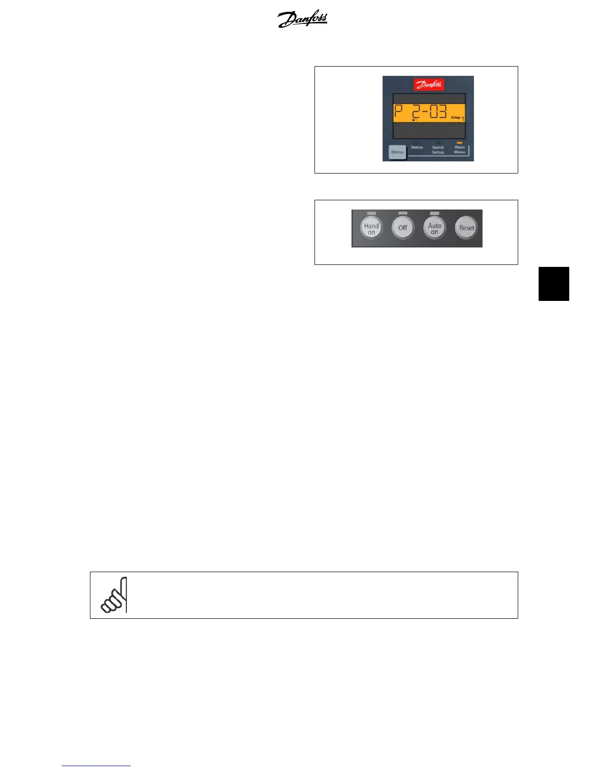 enables control of the drive via the LCP. [Hand on] also starts the motor and it is now possible to enter the motor speed data by means of the arrow