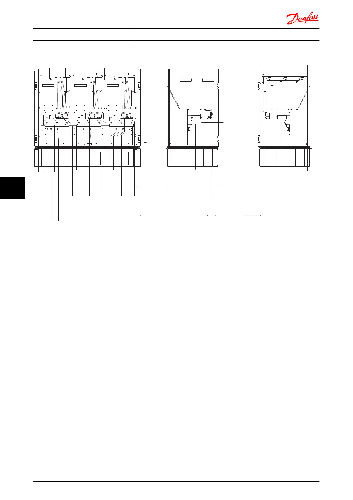 Illustration 7.35 Terminal locations - Inverter Cabinet (front, left and right side view). The gland plate is 42mm below .0 level.