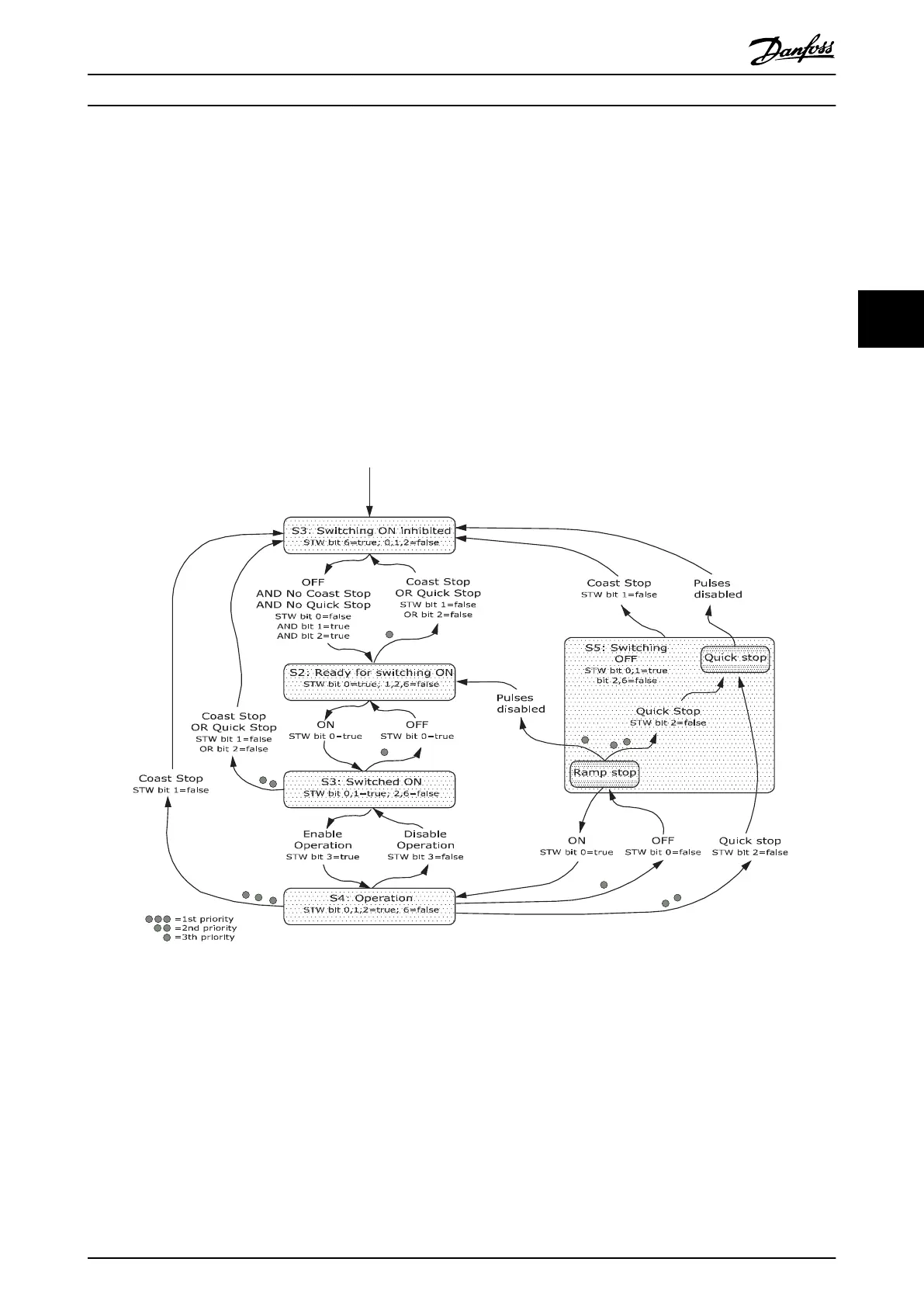 corresponding status bit indicates the actual state. The black bullets indicate the priority of the control signals, where fewer