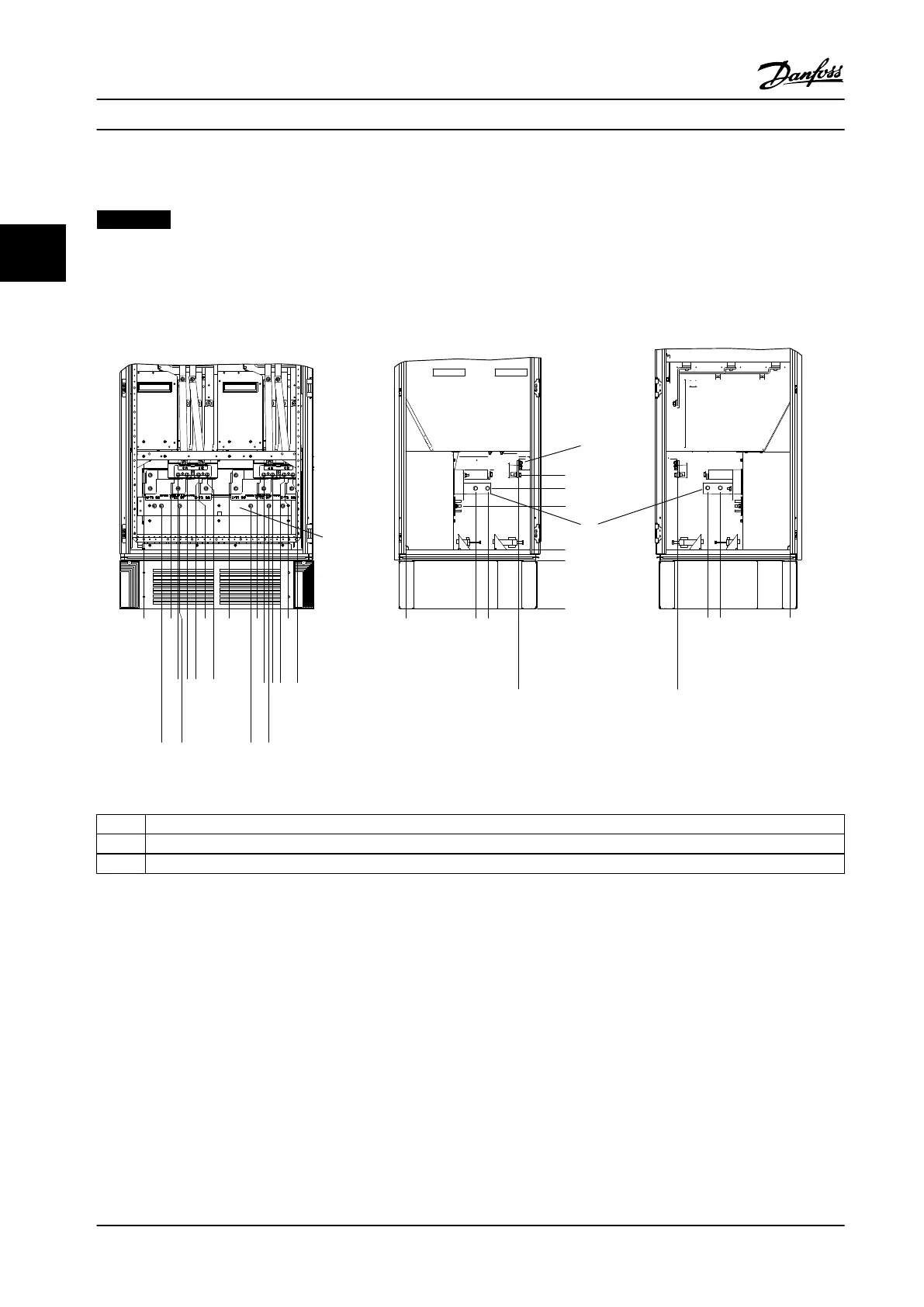 Figure 3.24 Terminal Locations - Inverter Cabinet - F1 and F3 (Front, Left and Right Side View). The Connector Plate is 42 mm (1.65