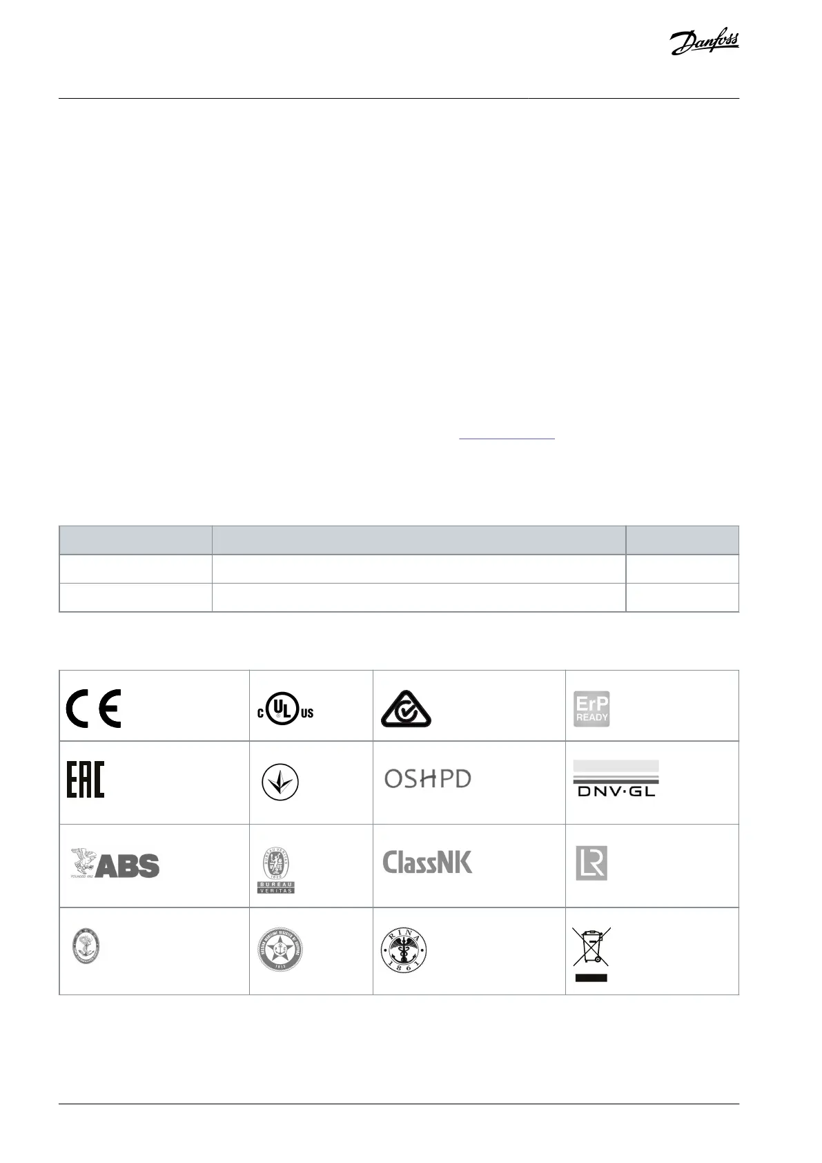 The following list is a selection of possible type approvals and certifications for Danfoss drives: