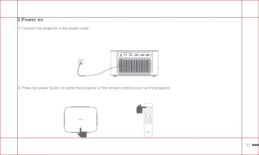 2 Press the power button on either the projector or the remote control to turn on the projector.