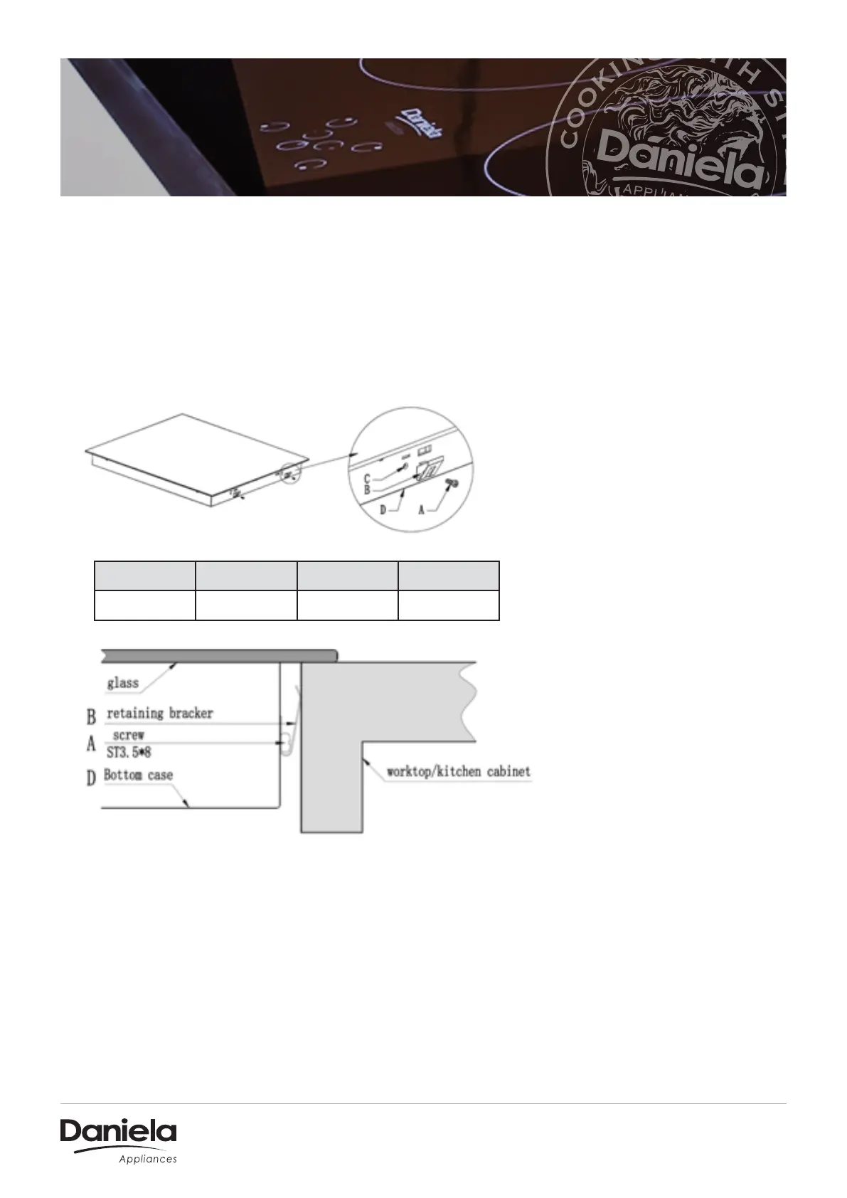 Fix the hob on the work surface by screw 4 brackets on the bottom case of hob (see picture)
