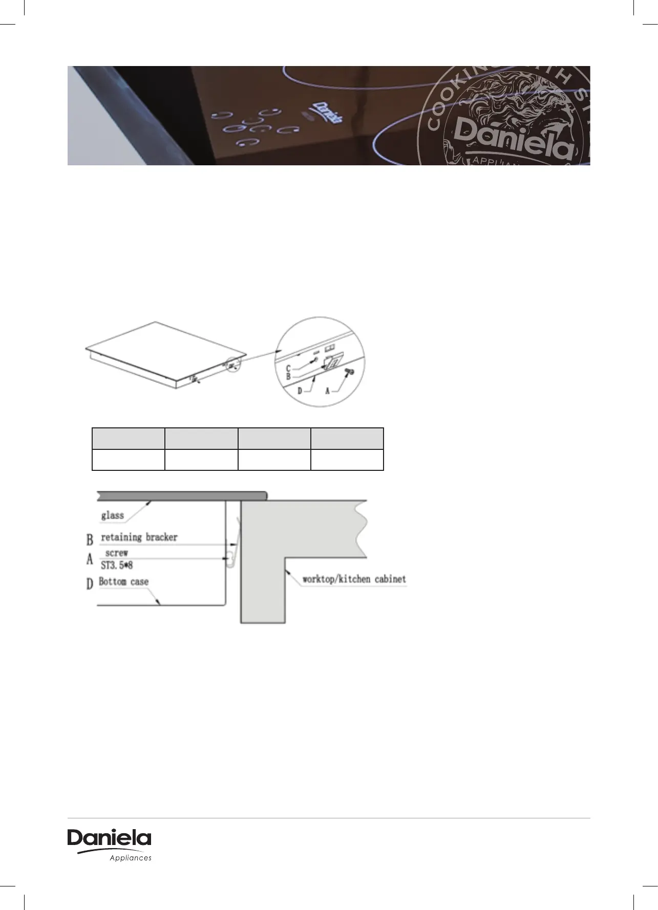 Fix the hob on the work surface by screw 4 brackets on the bottom case of hob (see picture)