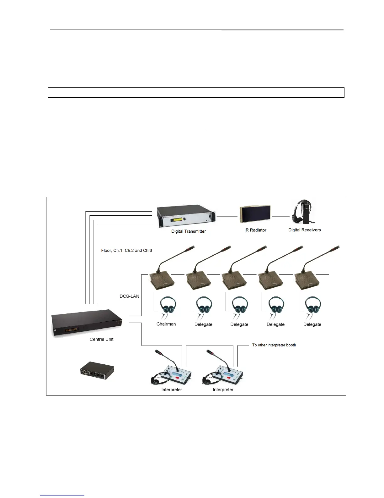 Figure 6.3-H DCS 6000 Digital Conference System with interpretation and wireless distribution, Ch.1 to Ch.3