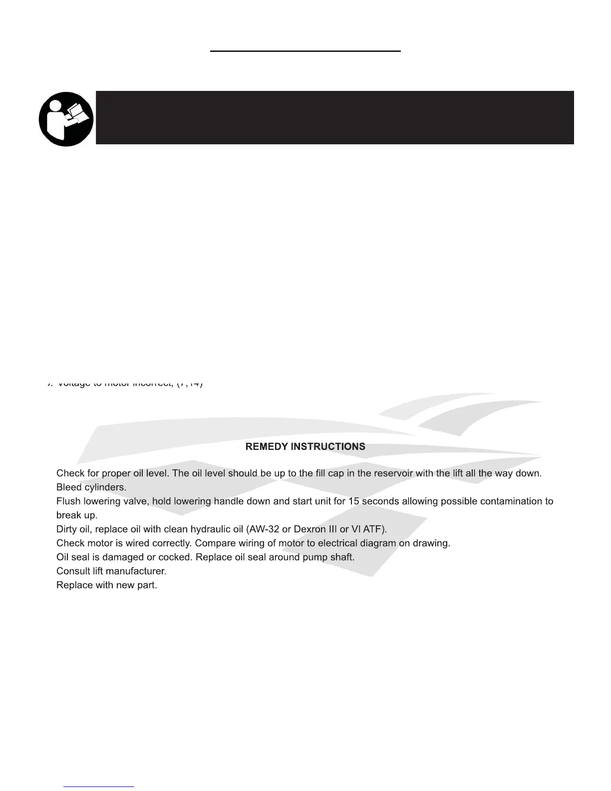 1. Check for proper oil level. The oil level should be up to the ll cap in the reservoir with the lift all the way down.