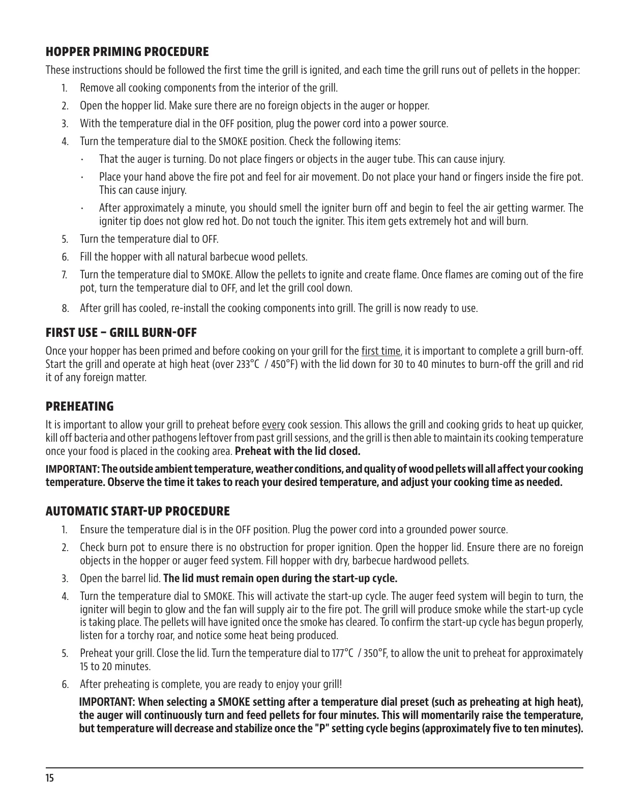 These instructions should be followed the first time the grill is ignited, and each time the grill runs out of pellets in the hopper: