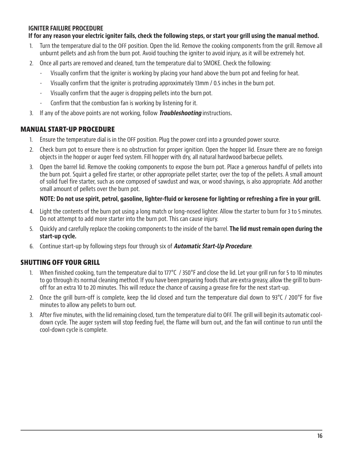 NOTE: Do not use spirit, petrol, gasoline, lighter-fluid or kerosene for lighting or refreshing a fire in your grill.