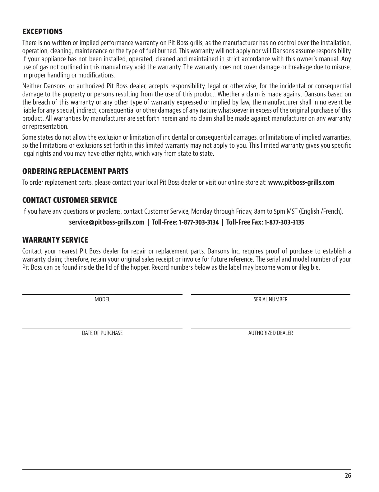 service@pitboss-grills.com | Toll-Free: 1-877-303-3134 | Toll-Free Fax: 1-877-303-3135