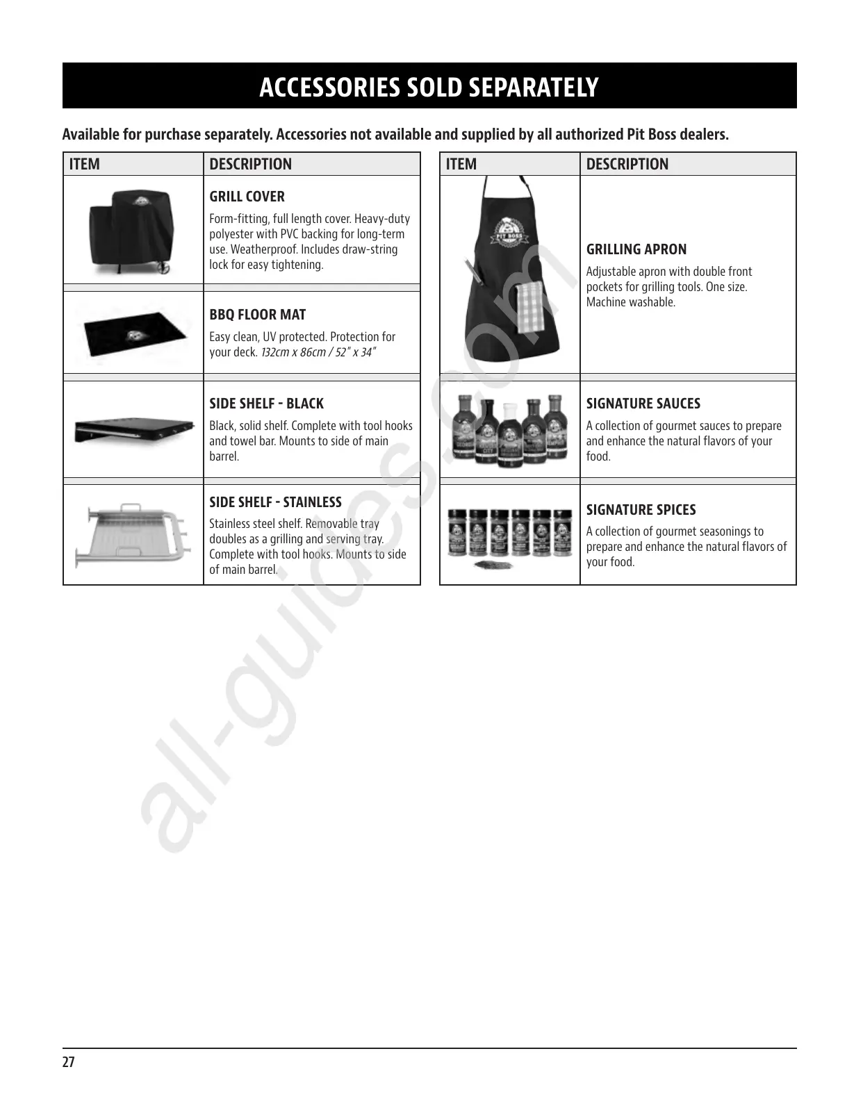 Available for purchase separately. Accessories not available and supplied by all authorized Pit Boss dealers.