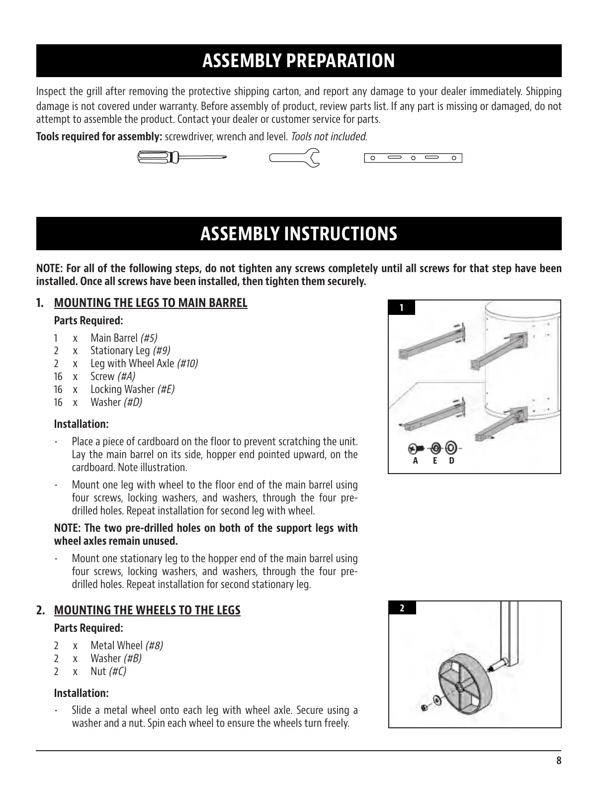 • Slide a metal wheel onto each leg with wheel axle. Secure using a